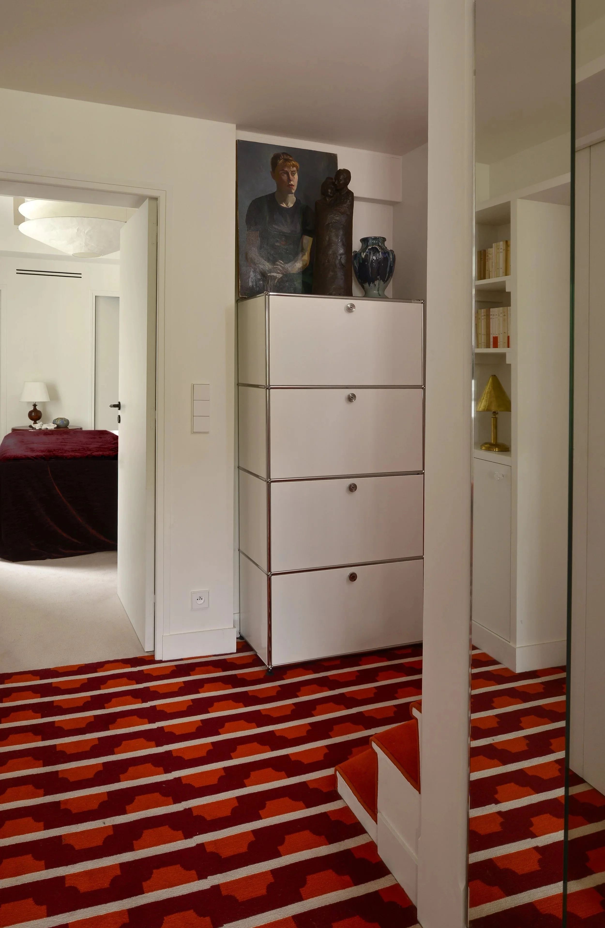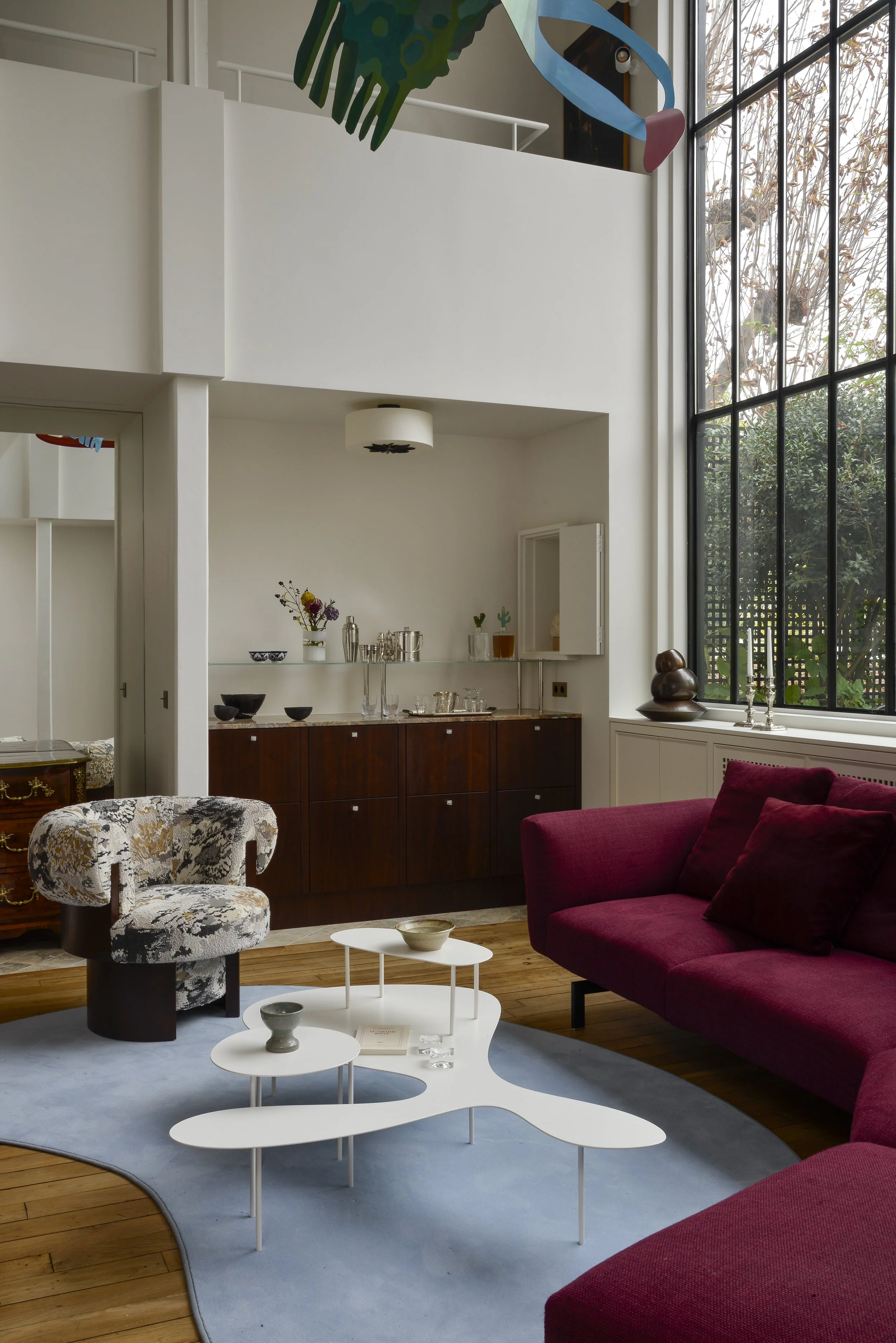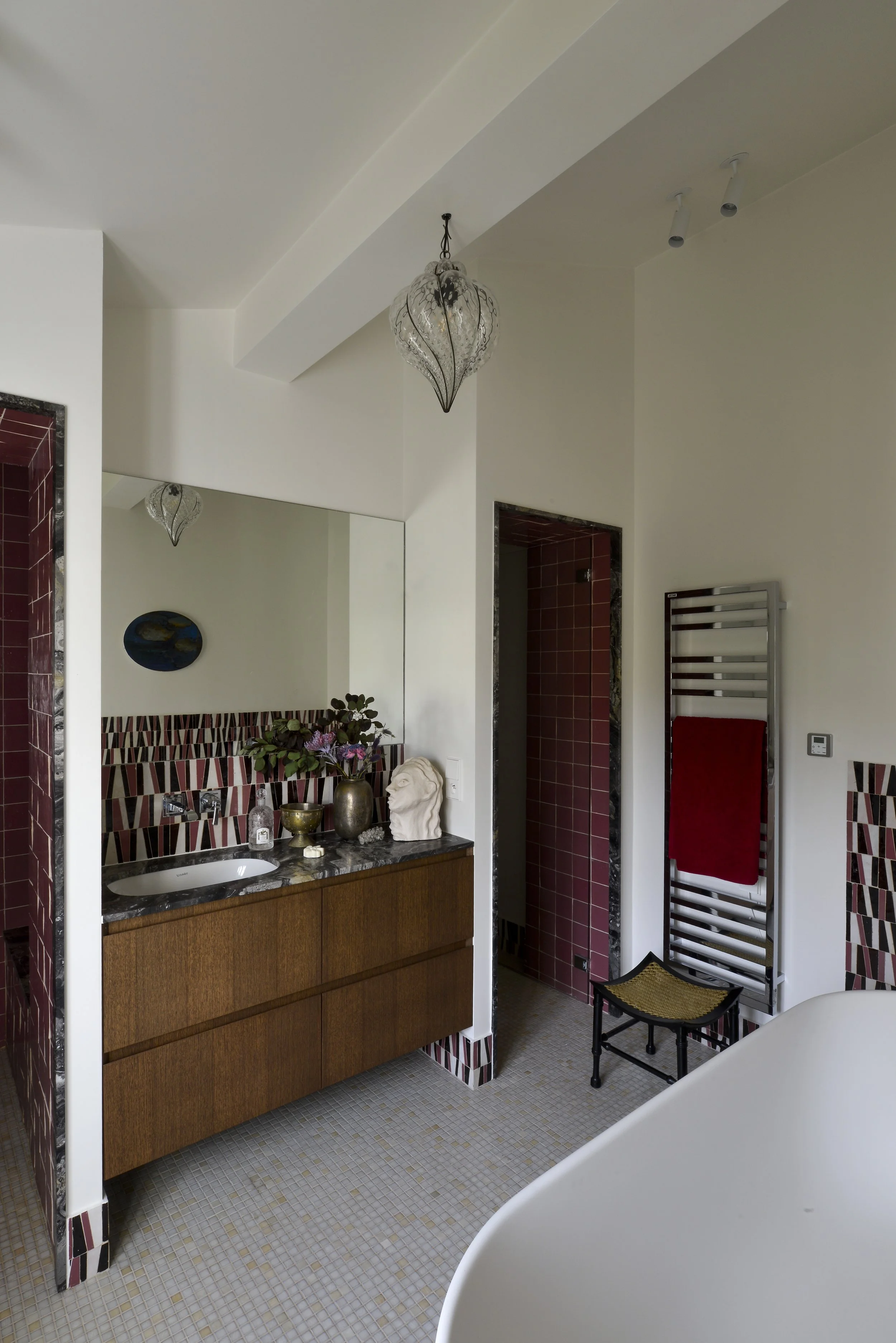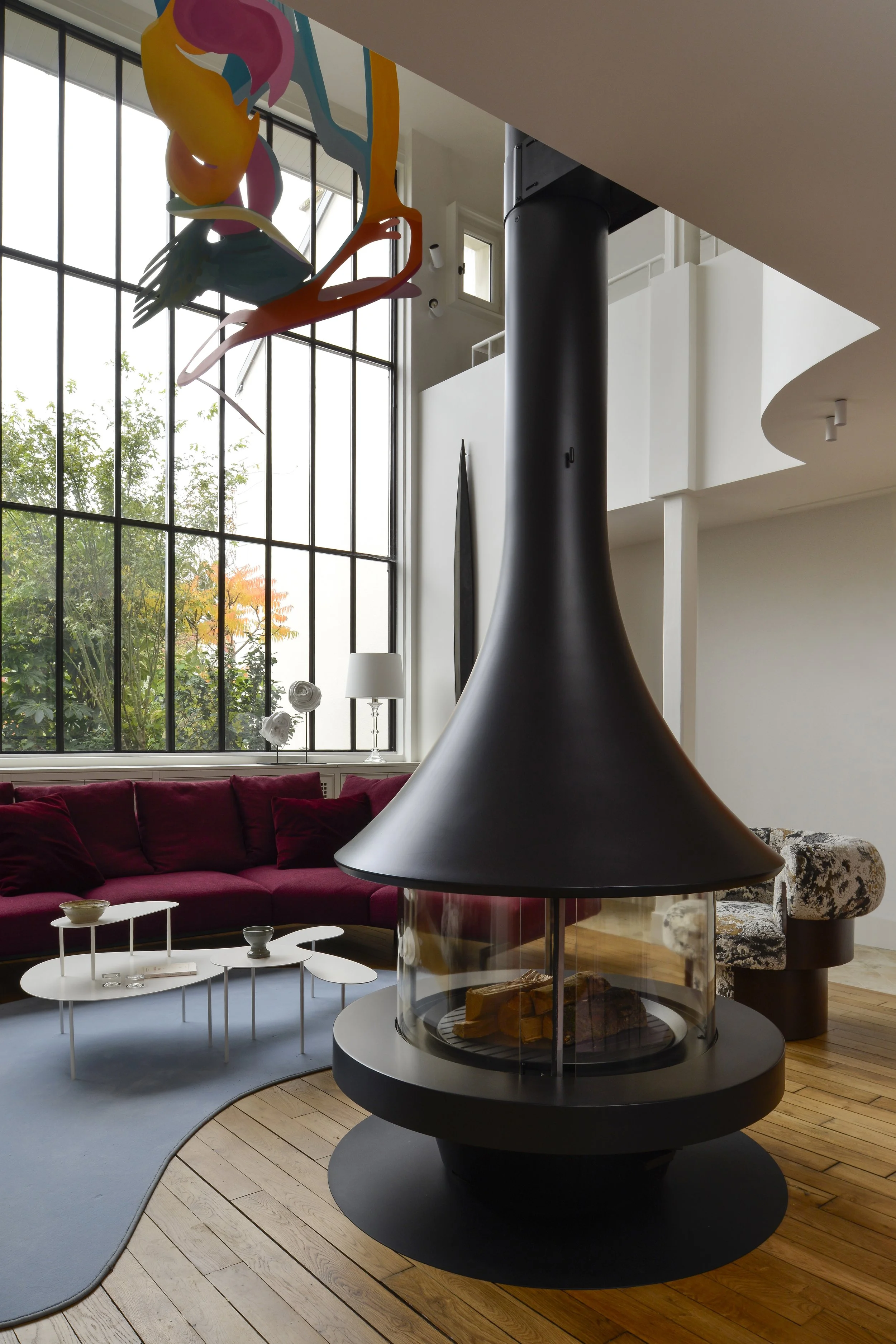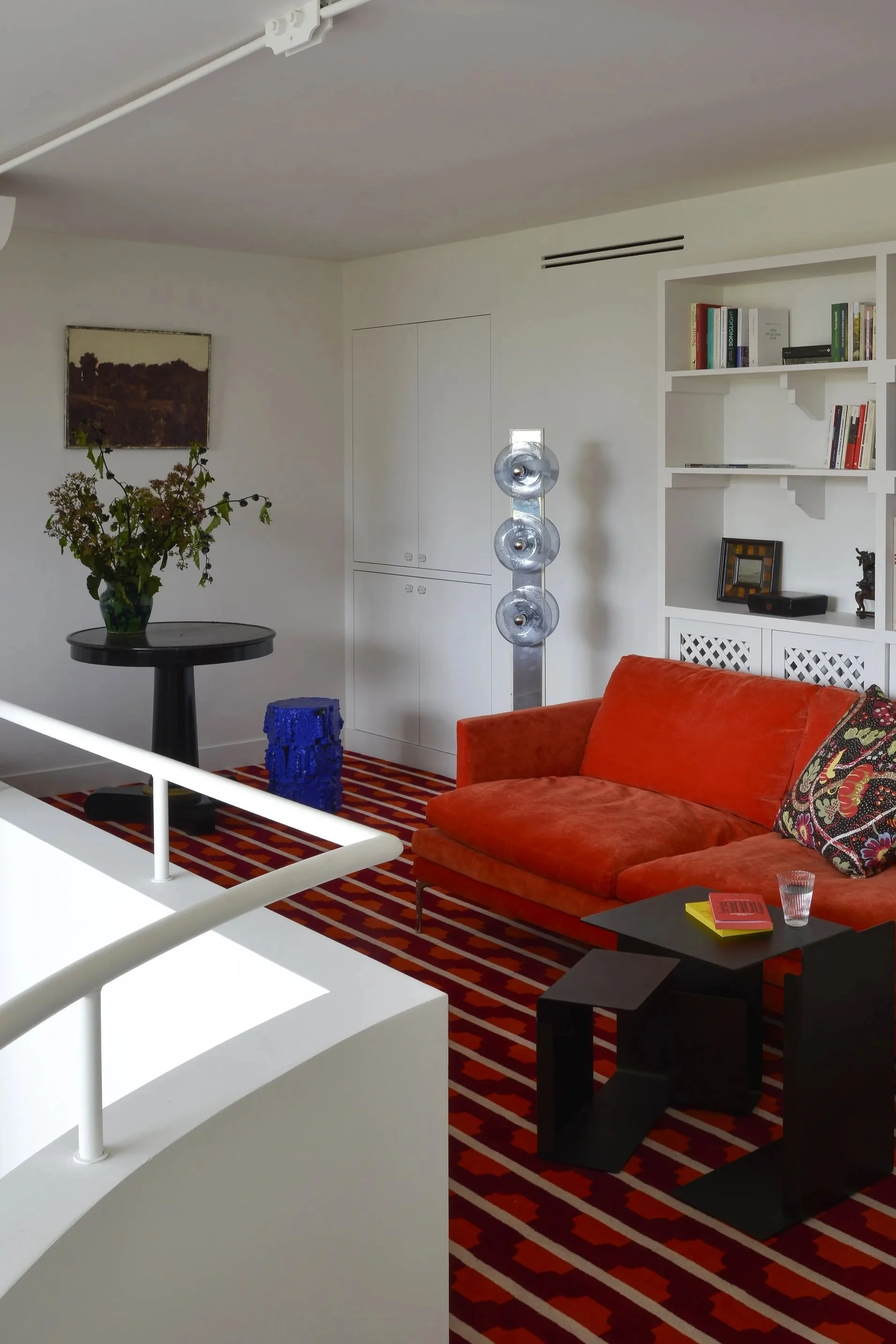 À deux pas de la capitale, cette maison de ville fut un atelier d’artiste. En témoigne cette majestueuse verrière qui apporte une lumière douce tout au long de l’année. Dans cette rénovation d’ampleur, nous avons porté une attention particulière à remodeler les volumes singuliers de cette maison: créer des points de vue entre les différents niveaux, repenser les coursives, générer des plans successifs d’un espace à un autre où le regard pourra vagabonder. L’emploi de la couleur a été l’un des prismes pour soutenir cela, à l’image de la palette d’un peintre entre touches et grands aplats.