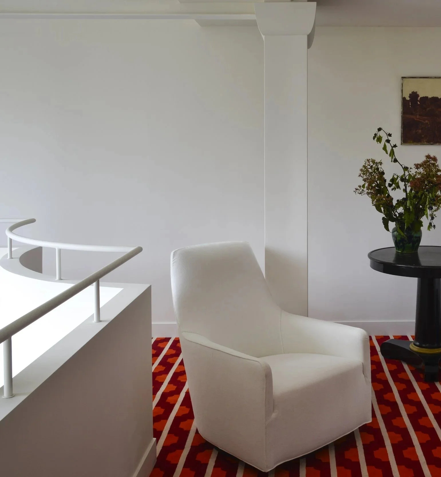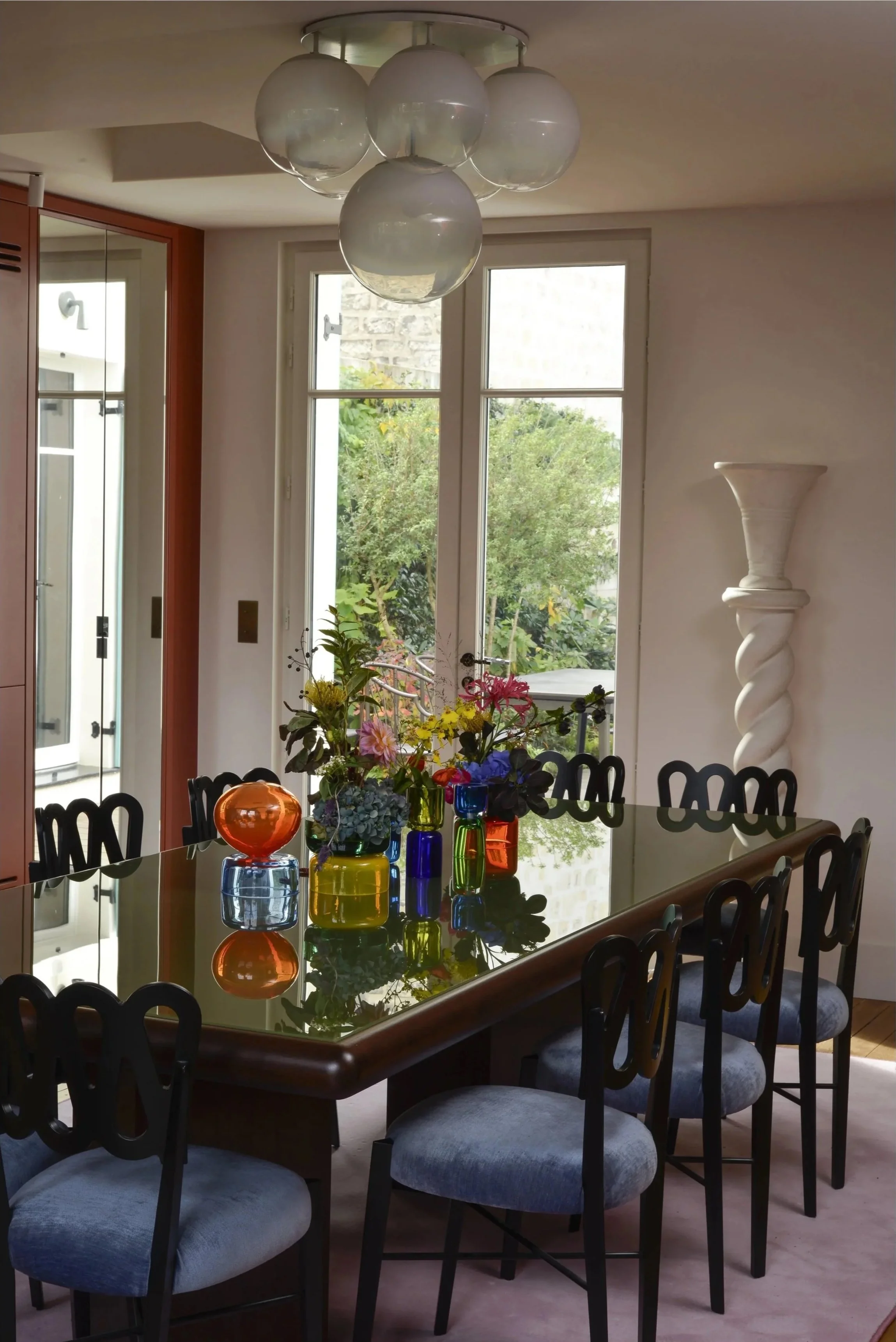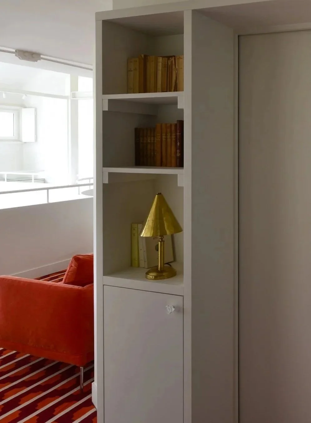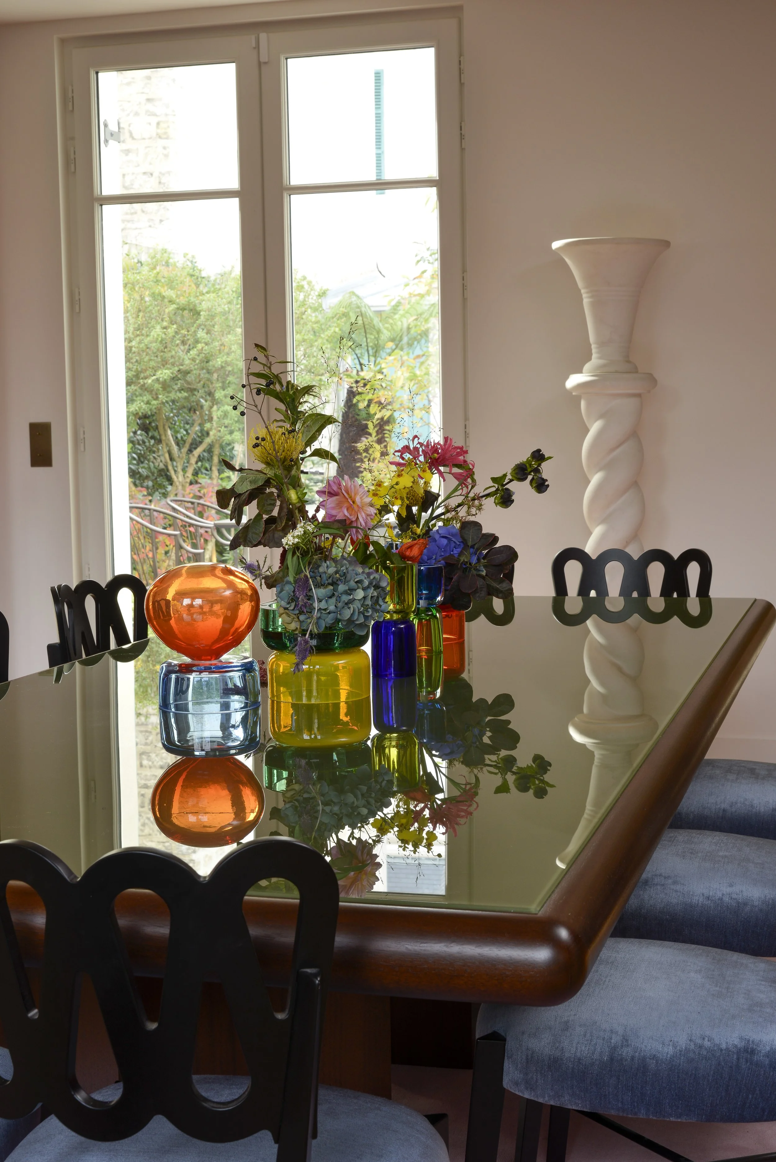 À deux pas de la capitale, cette maison de ville fut un atelier d’artiste. En témoigne cette majestueuse verrière qui apporte une lumière douce tout au long de l’année. Dans cette rénovation d’ampleur, nous avons porté une attention particulière à remodeler les volumes singuliers de cette maison: créer des points de vue entre les différents niveaux, repenser les coursives, générer des plans successifs d’un espace à un autre où le regard pourra vagabonder. L’emploi de la couleur a été l’un des prismes pour soutenir cela, à l’image de la palette d’un peintre entre touches et grands aplats.